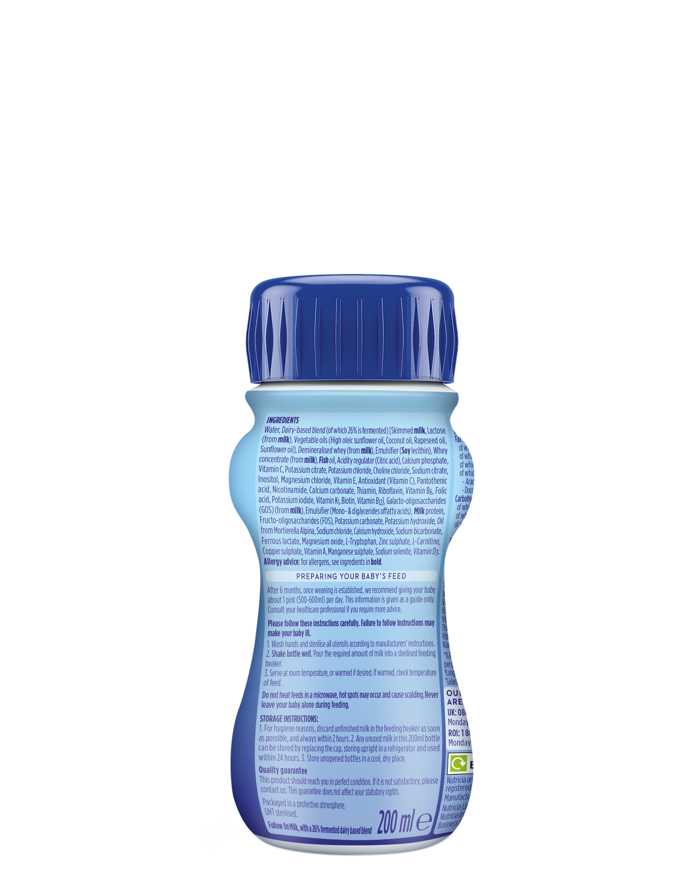 - Dairy-based blend (of which 26% is fermented) [Skimmed milk, Lactose (from milk), Vegetable oils (High oleic sunflower oil, Coconut oil, Rapeseed oil, Sunflower oil), Demineralised whey (from milk), Emulsifier (Soy lecithin), Whey concentrate (from milk), Fish oil, Acidity regulator (Citric acid), Calcium phosphate, Vitamin C, Potassium citrate, Potassium chloride, Choline chloride, Sodium citrate, Inositol, Magnesium chloride, Vitamin E, Antioxidant (Vitamin C), Pantothenic acid, Nicotinamide, Calcium carbonate, Thiamin, Riboflavin, Vitamin B6, Folic acid, Potassium iodide, Vitamin K1, Biotin, Vitamin B12]
